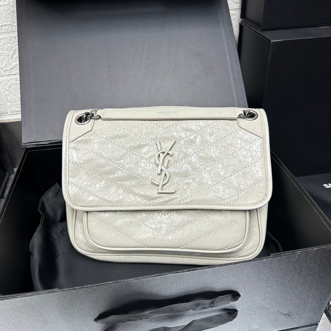 FEATURES A SLIDING CHAIN STRAP THAT CAN BE WORN ON THE SHOULDER OR CROSSBODY.